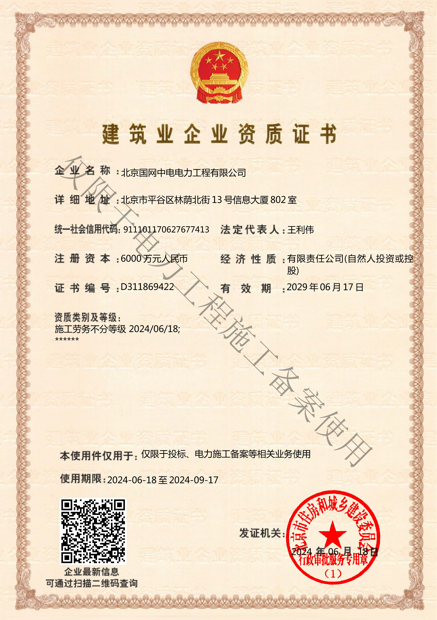 北京國網(wǎng)中電電力工程有限公司,已取得國家電監(jiān)會(huì)頒發(fā)的《承裝(修、試)電力設(shè)施許可證》、為電力施工承裝四級、承修四級、承試四級企業(yè)。北京市住房和城鄉(xiāng)建設(shè)委員會(huì)頒發(fā)的房屋建筑施工總承包二級、機(jī)電設(shè)備安裝工程專業(yè)承包二級、輸變電專業(yè)承包二級、城市及道路照明工程專業(yè)承包二級、市政公用工程總承包二級資質(zhì)、勞務(wù)不分等級,已通過ISO9001:2015 GB/T50430-2017質(zhì)量管理體系、GB/T24001-2016/ISO 14001:2015環(huán)境管理體系、